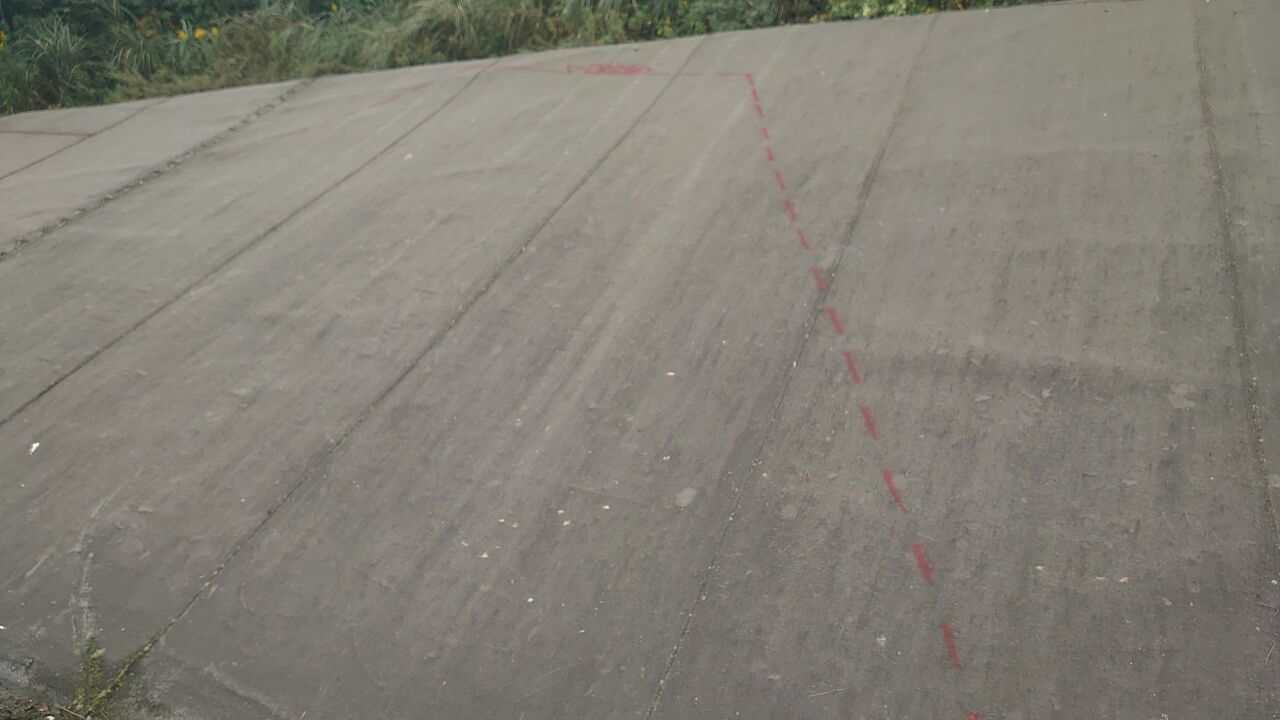 今回で言う黒い法面に盛土法面がぶつかる位置(赤いスプレー)です